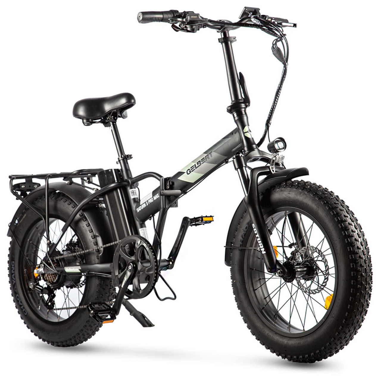 Мощный складной электро-велосипед Saturn 3 Pro Max (2025) от компании Gelbert для универсального передвижения по разным типам покрытия. В своей основе имеет алюминиевую раму, с улучшенной системой складывания рулевой колонки и самой рамы. Для комфортного передвижения по любому типу дорожного покрытия имеется амортизационная вилка ходом 40 мм, с блокировкой, а также 20-ти дюймовые покрышки шириной в 4 дюйма, для большего пятна контакта с дорогой. Модель оборудована электромотором на заднем колесе, мощностью в 750 Вт и съемным аккумулятором в 13 Ач (напряжение аккумулятора 48 В), что позволяет достигать максимальной скорости в 30 км/ч и максимального пробега до 40 км. Велосипед оборудован 7 скоростной трансмиссией от компании Shimano, для облегчения преодоления подъемов. Управлять мощностью мотора, а также контролировать показатели поездки удобно при помощи информационного LCD дисплея, расположенного на руле. За безопасную и контролируемую остановку отвечают дисковые механические тормоза. Для повышения уровня комфорта Saturn 3 Pro Max, в комплектацию велосипеда входят широкие полноразмерные крылья, подножка, мягкое комфортное сидение, а также удлиненный багажник с крепким фиксатором.